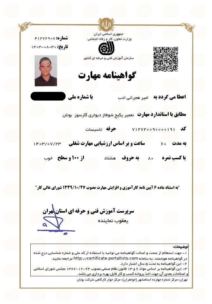 دارای مدرک فنی حرفه ای و کسب نمره 80 از 100